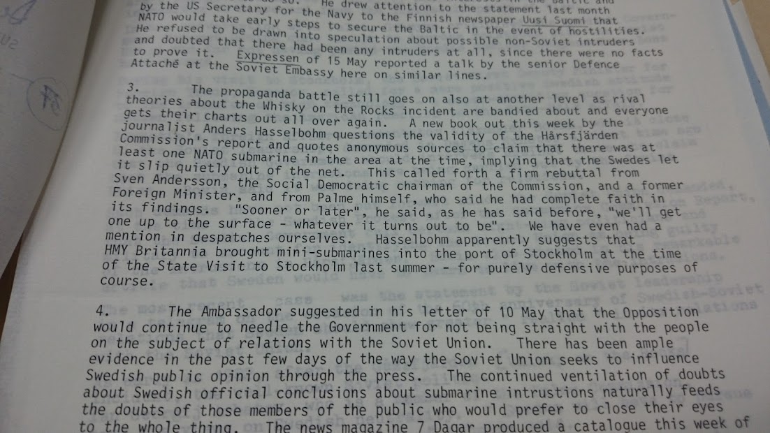Här kommer lite mer av författaren/journalisten Pelle Neroths framgrävda brittiska diplomatrapporter, från 1984, referenser till ubåtskränkningarna som vanligt. DSC_0330.JPG DSC_0331.JPG De brittiska militärattachéerna över åren var ofta kritiska till det svenska försvaret förmågor, främst då arméns...