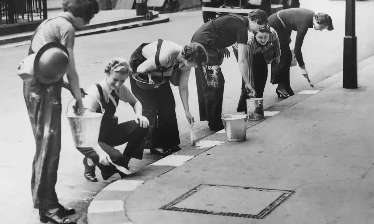 Damer målar kantsten i London 1939