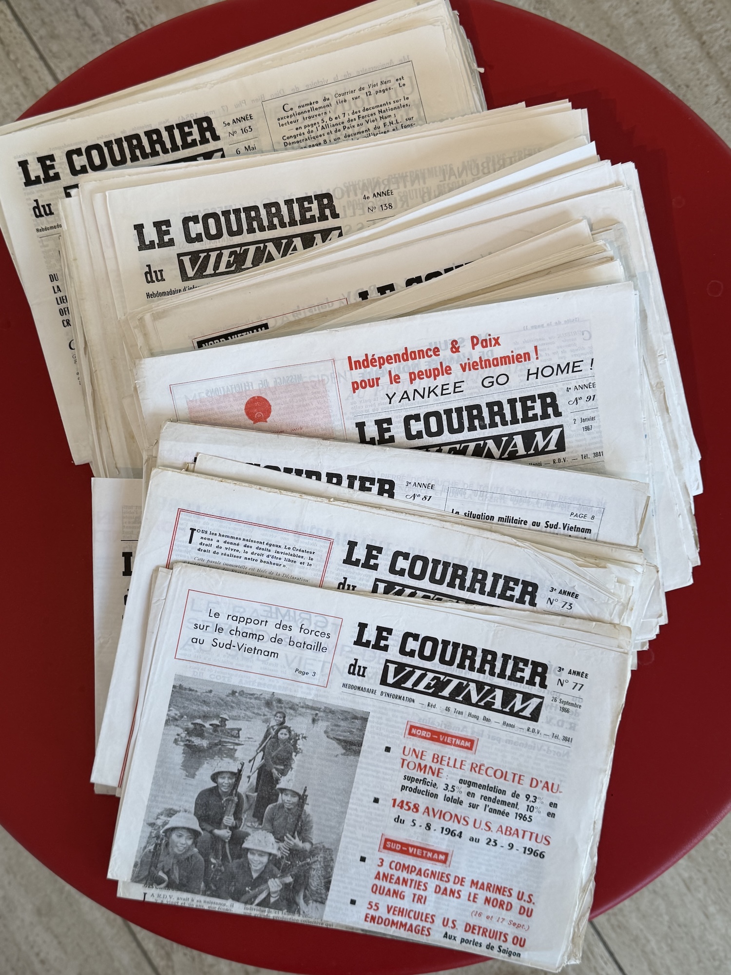 Hittade i "mitt" antikvariat en bunt veckotidningar som väl passar in i den här tråden - "Le Courrier du Vietnam". Över hundra propagandatidningar, utgivna mellan 1966-68.