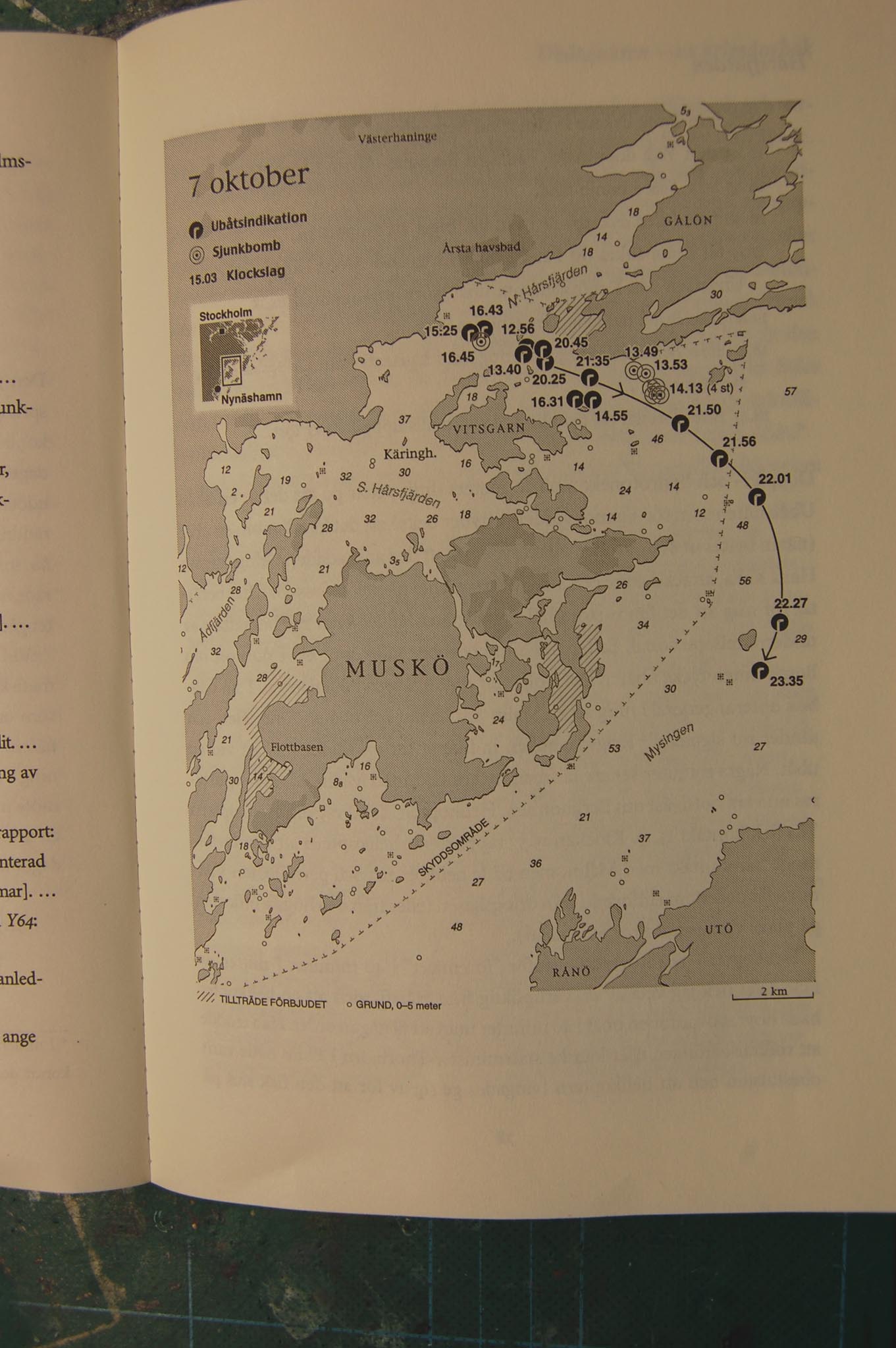 Därefter fälls sjunkbomber mellan 13:49 - 14:13 i ett område som ser ut att vara snabbaste vägen norrut för en mindre farkost som tog sig ut ur näten runt klockan 13:00. Norr om Skärbåtsholmen grundar det till 8.5m.