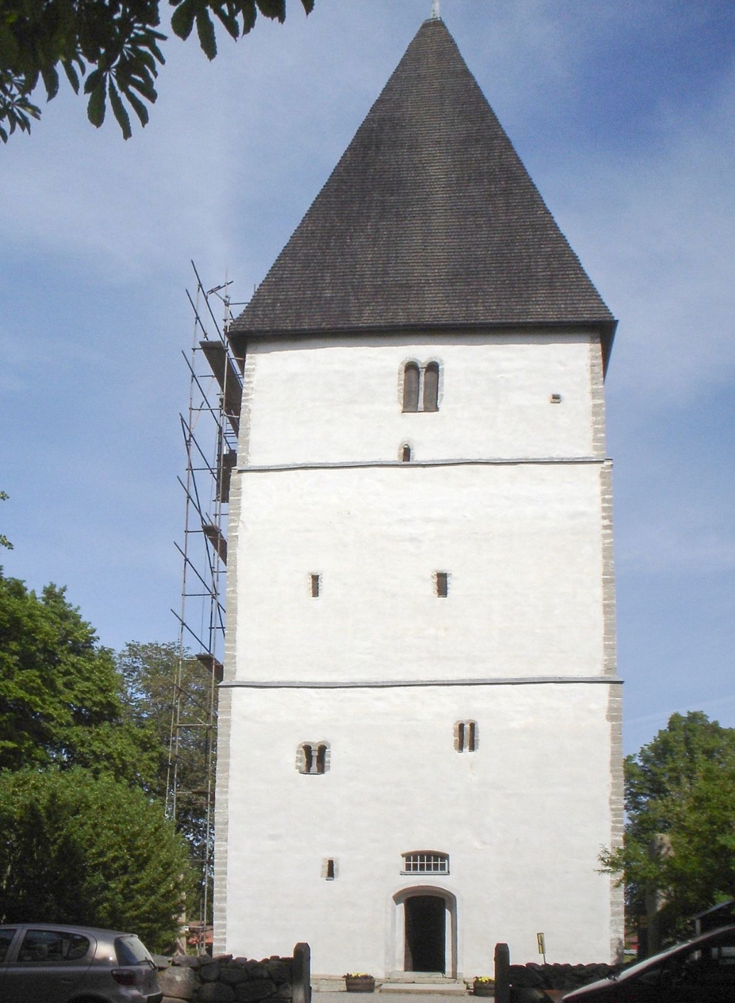 Här en bild på ett mäktigt kyrktorn, ett av landskapets mäktigaste. Det hävdas att en av landets mäktigaste män växte upp i kyrktornet, vars två nedre våningar skall inrymma en bostad.