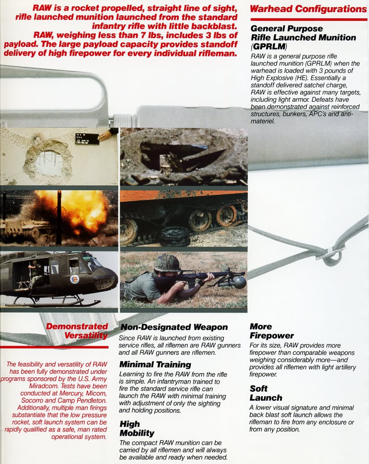 Det är en raket som avfyras genom att man skjuter av en vanlig kula. Raketmotorn är snedställd och skall på det viset ge en rakbana mot målet som var tänkt att vara NVA eller Vietcong bunkrar. Har inget namn på den än men ska googla lite...Och svaret blev RAW, Riflemans Assoult Weapon.