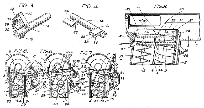 Fel - ett unikt patent - med två dubbelrader av 9mm patroner - BAKOM varandra..... - medgav kapacitet för sextio skott.