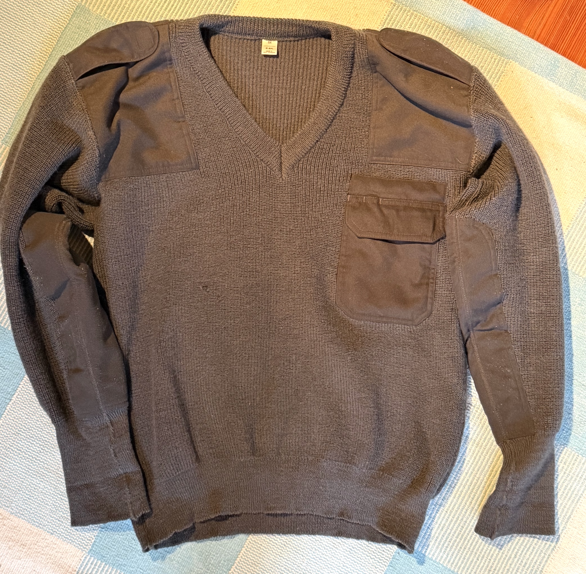 En tysk militärtröja, som länge luktade. Jag hittade och köpte den i ett militärhistoriskt museum...i shoppen. Varm å go'! Men, frun är inte helt begeistrad...
