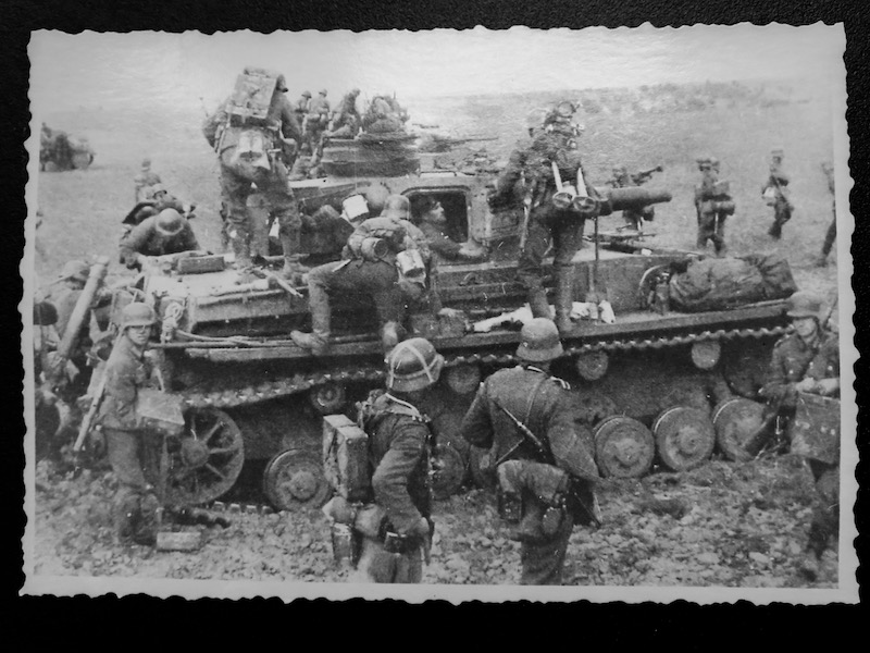 ...där det kryllar av tyska soldater med packning på ryggen av olika slag. Vad? - och vad för pansar?