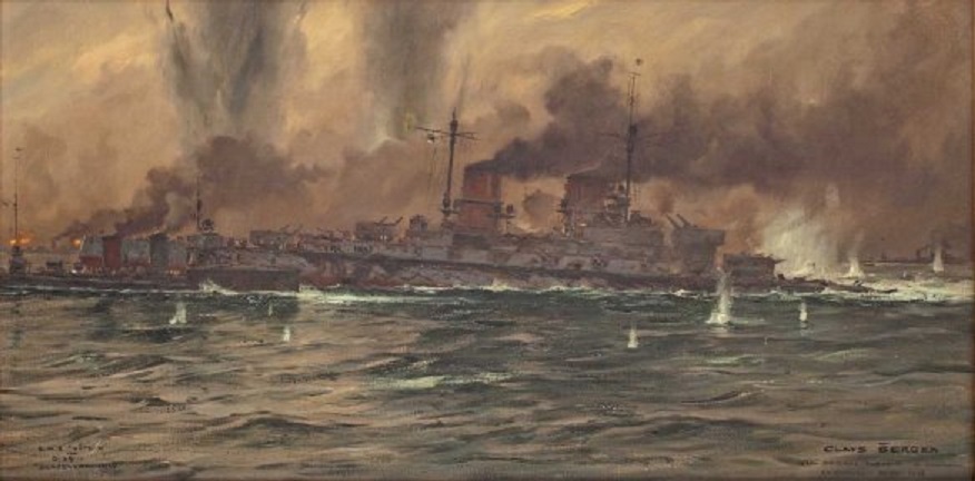 Amiral Beatty's flaggskepp - slagkryssaren HMS LION - tar stryk av Kaiserns SMS LÜTZOW under Jutlandslaget