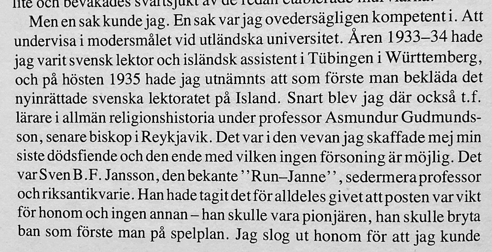 Han syftade på professor Sven BF Jansson, som ansågs vara Sveriges främste expert på runor. Honom kände jag till redan som tonåring, eftersom ibland medverkade i radioprogrammet Svar idag i SR P1.
