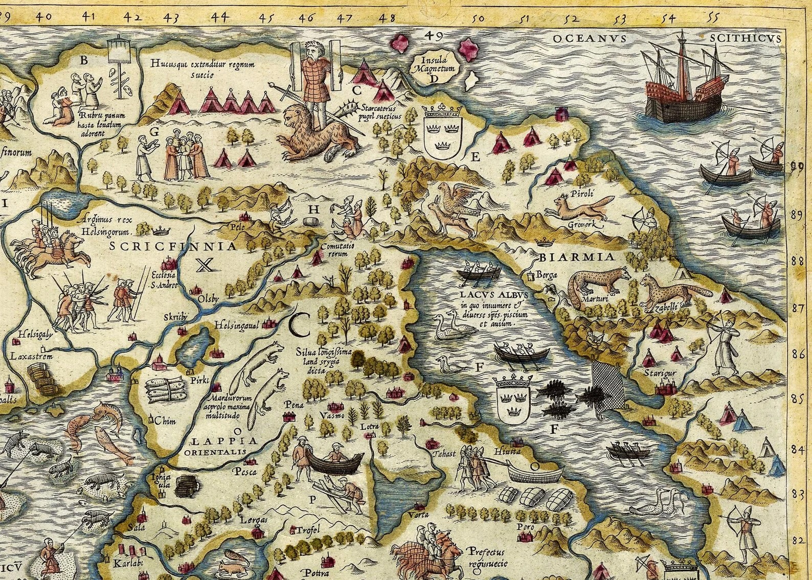 Lacus Albus, alltså vita havet, framställs som en insjö. Kartritaren verkar ha dålig kännedom om de nordiska länderna Carter Norge blir del av vårt rike vilket skapar ishavskust.