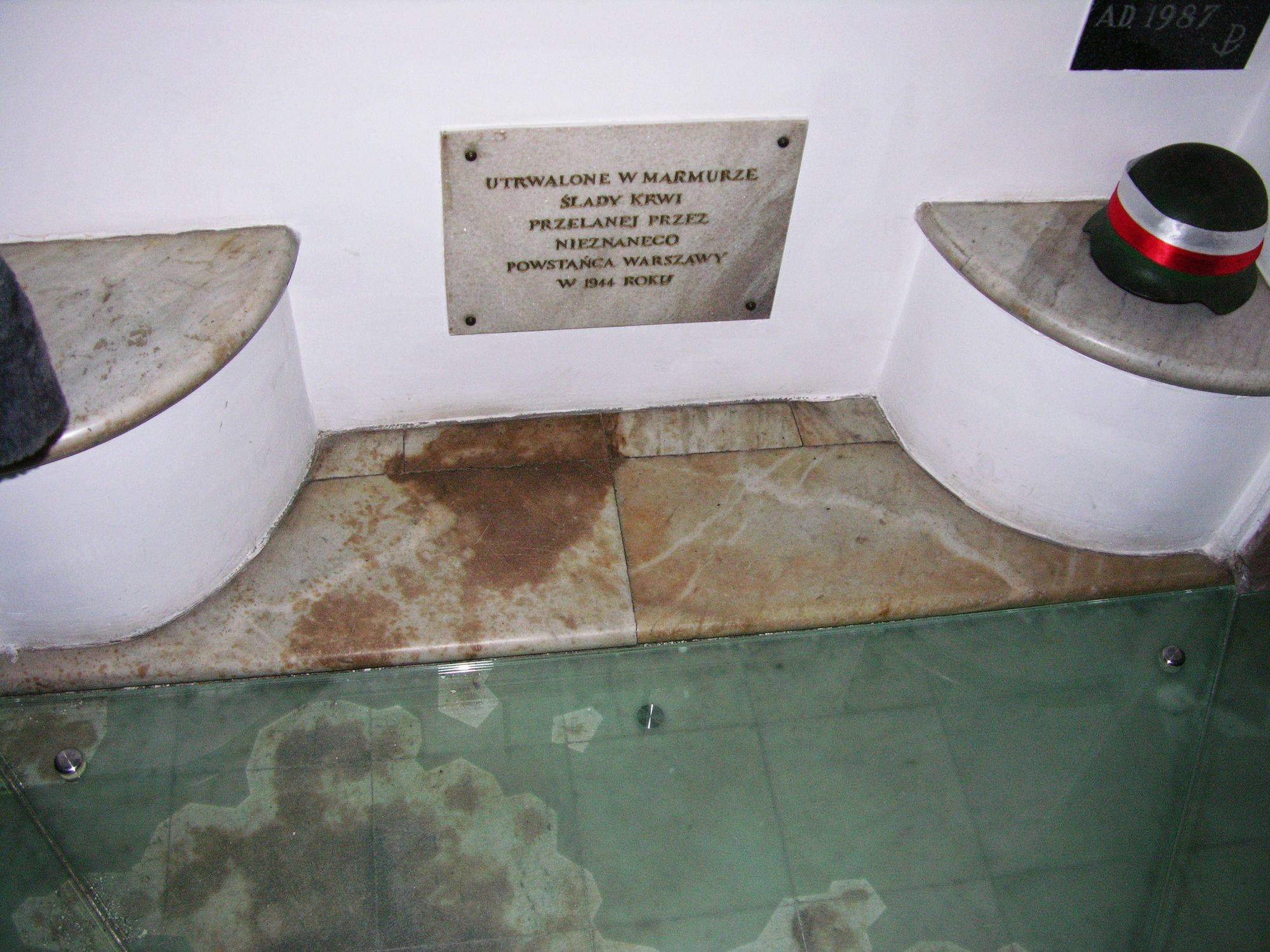 Det är blodfläckar efter en upprorsman/kvinna och platsen är Willi Bohdana Pniewskiego.