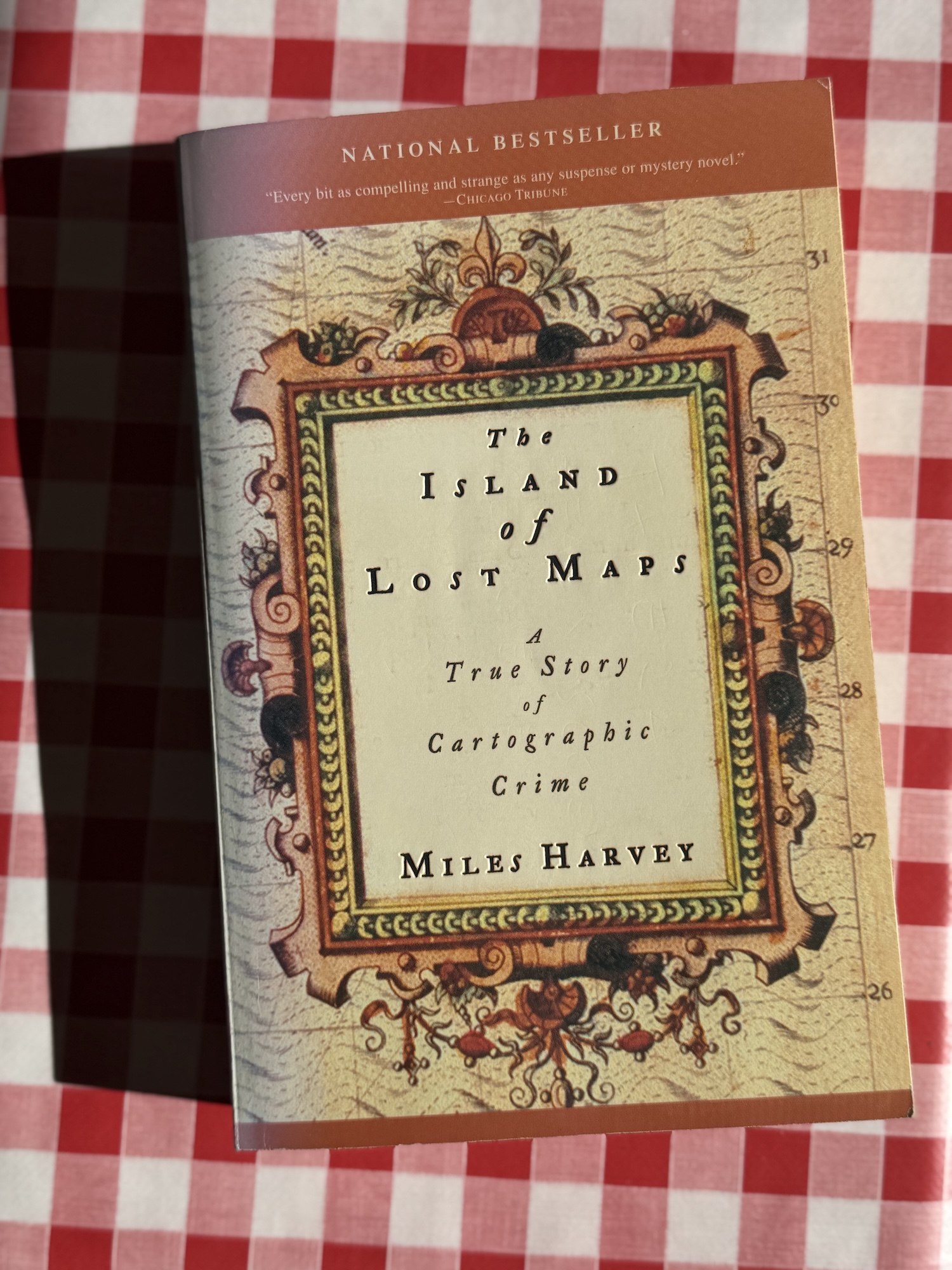 ”The Island of Lost Maps” berättar historien om en märklig brottsvåg: stölden av ett stort antal värdefulla, flera hundra år gamla kartor från några av de mest framstående forskningsbiblioteken i USA och Kanada. Gärningsmannen var Gilbert Joseph Bland, Jr., en gåtfull antikhandlare från södra Florida, vars snabba stöter över hela landet hade gått praktiskt taget oupptäckta tills han greps 1995 – och avslöjades som den mest produktiva amerikanska karttjuven i historien. När Miles Harvey nystar upp mysteriet kring Blands liv kartlägger han världen av kartografi och kartografiska brott och väver samman en fascinerande berättelse om upptäcktsresor, hantverksskicklighet, skurkaktighet och lockelsen av det okända.“