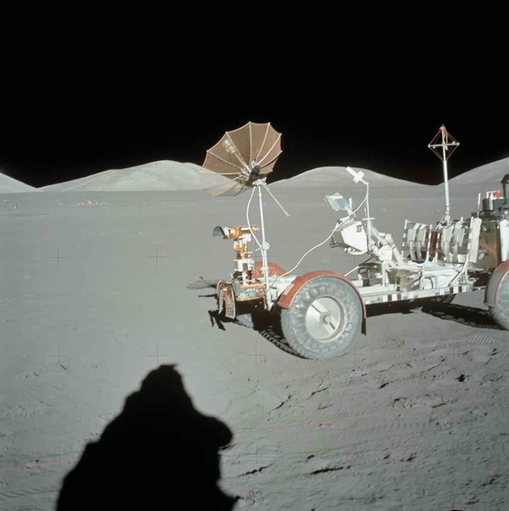 Men det som förbryllar mest i denna bild är kanske att månbilen inte verkar gjort några spår i sanden?