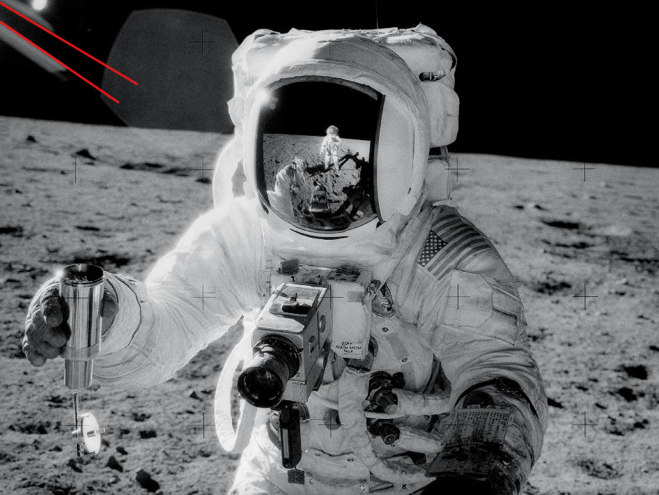 2. I visiret ser man tydligt att det är en distinkt ljuspunkt på marken, vilken inte kan bortförklaras på samma sätt som att astronauten badar i ljus, nämligen med att det är en reflex från landaren, då den är bakom landaren. Ingenting lämnar reflexer på skuggsidan. Jag tror inte heller att ljuset runt astronauten är en ljusreflex från landaren, det ser helt enkelt inte ut så, däremot ser vi att starkt ljus kommer från vänster övre hörn. Detta ljus är enligt min mening det som kastar ljus över marken där han står.
