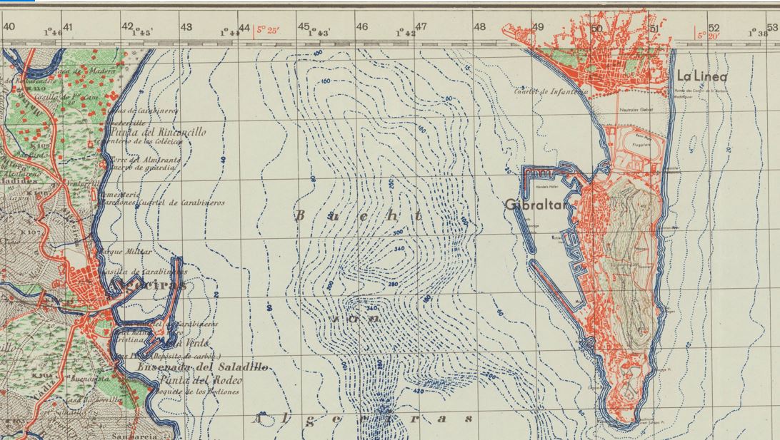 Varje ruta är väl 1km, så Algeciras ser ut att ha åtminstone en km kaj redan, och mer, om det som sticker ut inte bara är något för att fixa en lugn ankringsplats. Där måste ha skett en hel del utveckling under mellankrigstiden då. Här är fotot från 1928, där hamnen knappt är påbörjad.