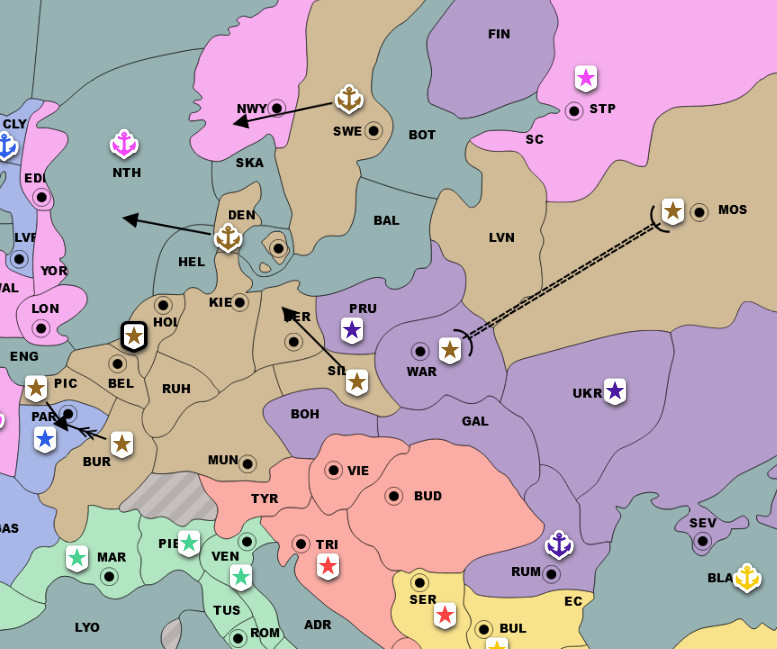 Här är standarddrag till öppning, problemet är att Ryssland är det enda land som kanske inte får något nytt område. Om Tysklands flotta går till Danmark kan den sedan stoppa den ryska flottan från att inta Sverige. På samma vis är det inte säkert att man lyckas inte Rumänien.