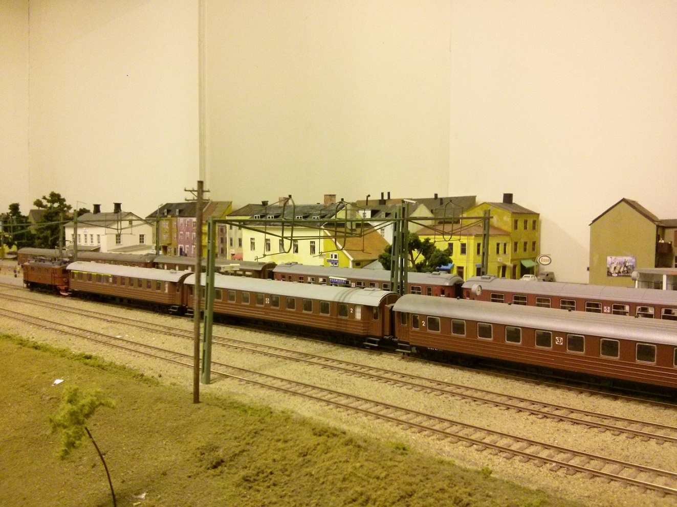 Typiskt SJ lokalpersontåg från 1970-talet. Vagnarna är byggsatser från UGJ, och är byggda som de ombyggnader som gjordes av Kalmar Verksstad under 1970-talet, med AC, nya inredningar, nya fönster m.m. Ursprungligen byggdes vagnarna på 1940-talet men på grund av svår fordonsbrist moderniserades de, och klassificerades som A3 (1 klass), B3 (2 klass) och AB7 (kombinerad 1 och 2 klass). Loket är ett typ Da, ett av SJs vanligaste ellok, som byggdes under 1950-talet, fabrikat Roco. Försett med DCC datadekoder m.m.