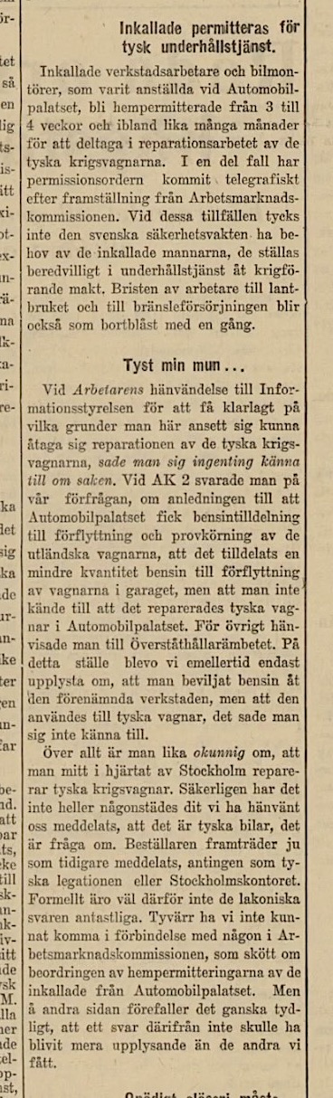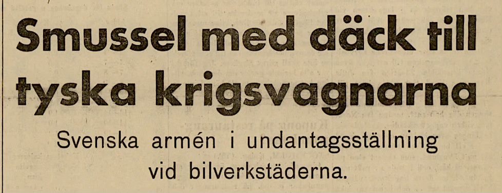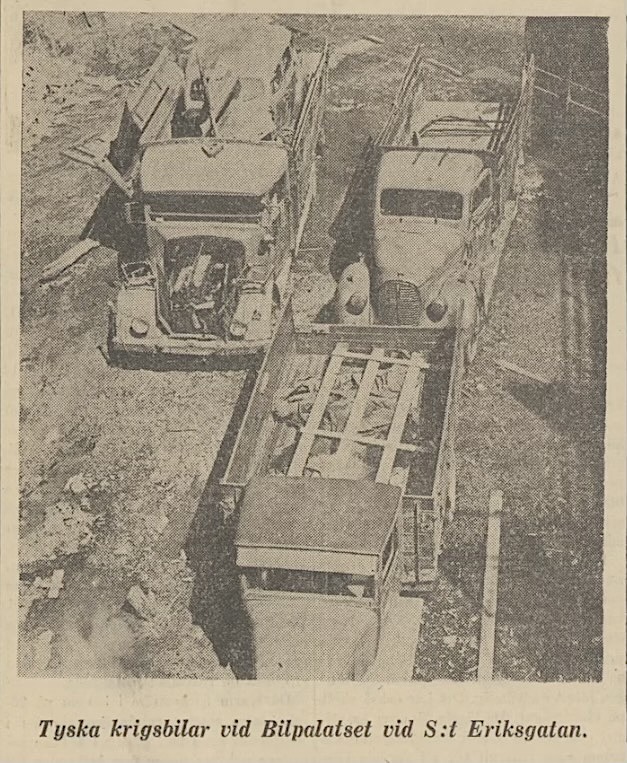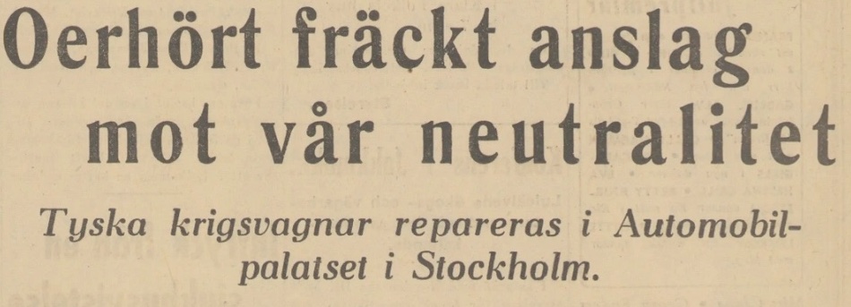 "Tyska krigsvagnar repareras i Automobilpalatset i Stockholm" osv.