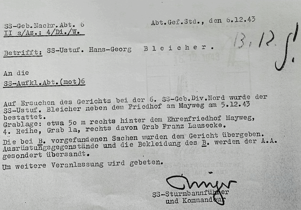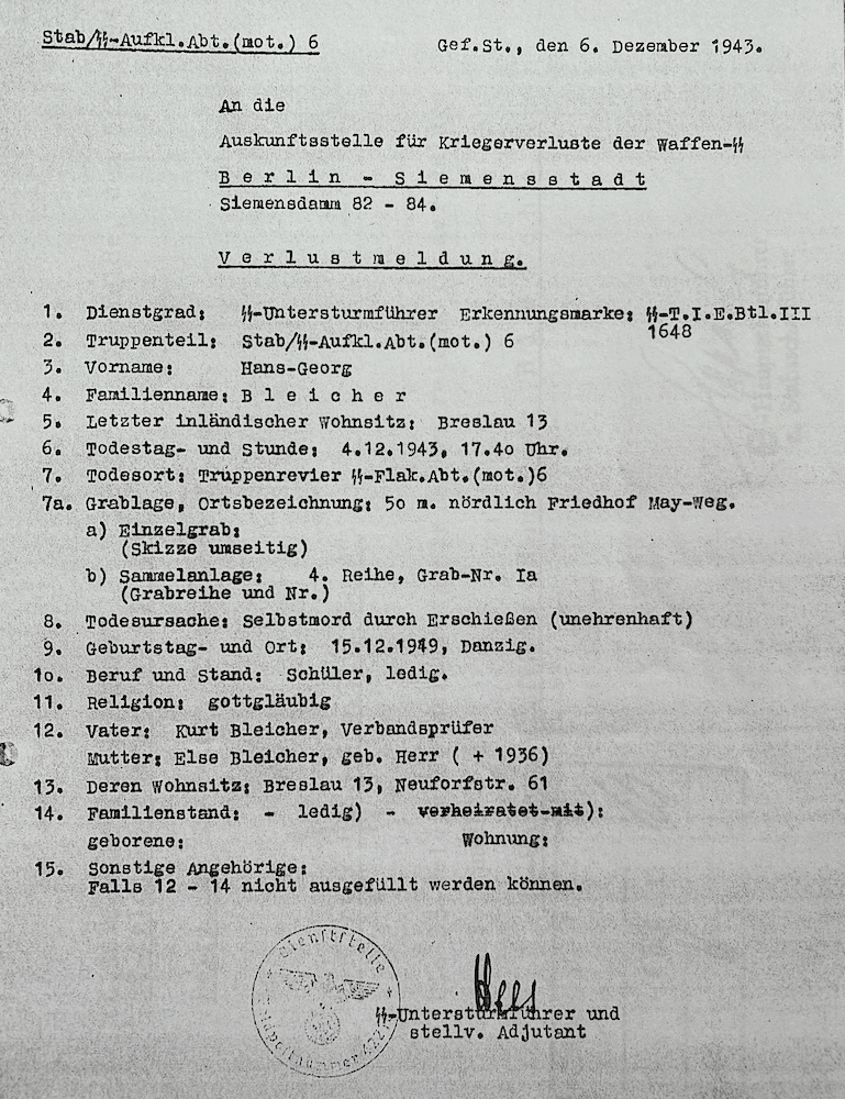 SS-Untersturmführer Hans-Georg Bleicher sätter sig en kula för pannan den 4.12 1943, klockan var tjugo i sex på kvällen. Hans död blir undersökt, rätten och dess medicinska avdelning yttrar sig ( i säkert en hel del mer än de föreliggande åtta dokumenten ...), och Bleichers död får stämpeln "unehrenhaft".