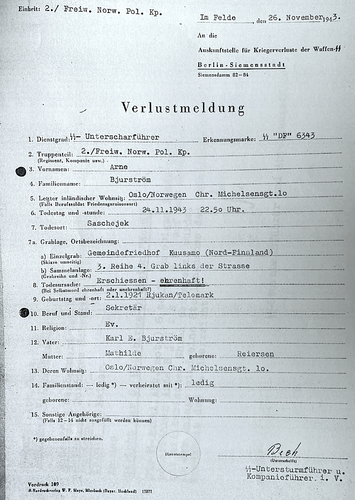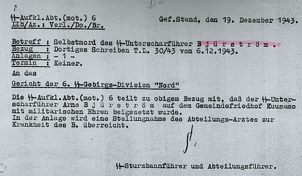SS-Unterscharführer Arne Bjurström gör det samma, 24.11 1943, vid halv tio-tiden på kvällen. En norrman från norska 2./Freiw. Norw. Pol. Kp., som uppenbarligen också fått nog av kriget. Tar sin pistol 38, skjuter sig i huvudet och dör en timme senare i kompaniets sjukstuga.