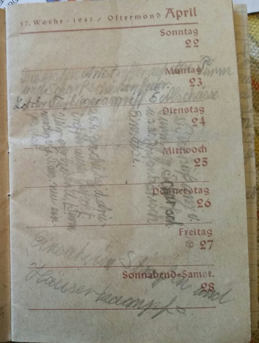 Tack för dina tankar och att du delar med dig, och hoppas vi får se mer av anteckningarna i almanackan. 27 och 28 april..."Einsatz im Strassen und Häuserkampf", som jag antar att din sagesman deltog aktivt i ? Har du f.ö. fått reda på när han är född, verkar ganska ung på bilden...
