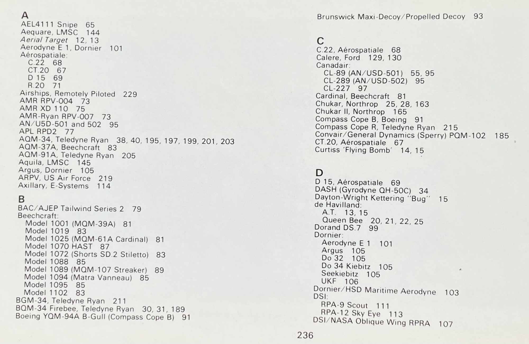 Redan då beskrevs uppåt tvåhundra maskiner, från minis till flygplanstora, de flesta i ett experimentellt stadium. USA överväger, England och Frankrike har ett antal, annars är det bara Australien (Jindivik) och enstaka europeiska länder som testar RVPs. Från Sovjetunionen en Lavochkin. Ordet droner används ännu inte...