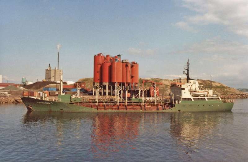Tack Donkeyman för den biten! Jag anade nåt - då hon hade pålmaster med böjda ventilationsrör - men kom inte på något bättre svar på Stellans fråga....Nej, nej, nej. Detta är inte någon "Wood Chip Carrier". En sådan har höga sidor därför att "Wood Chip" är en volymlast. Den här bilden visar en chemtanker. Den hette Thuntank 7 och gick med produkter till skogsindustrin. Men är numera skrotad