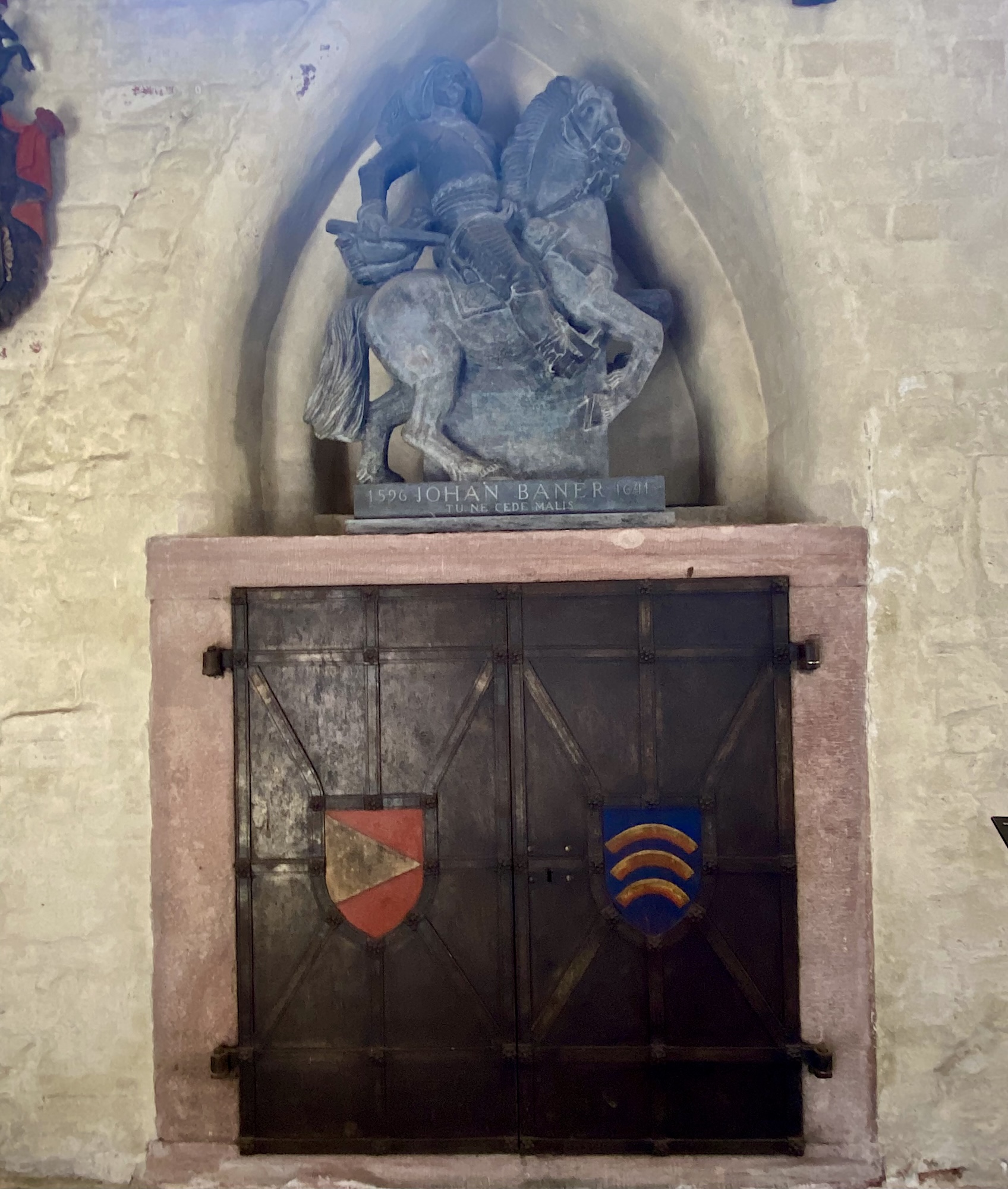 Johan Banér i täljsten, faktiskt skulpterad först 1942 av en Ivar Jonsson, med Banérs valspråk: "TU NE CEDE MALIS" ("Giv ej vika för motgången"). Och nedanför, vid ingången till kämpens grav, två enkelt målade sköldar uppsatta på dörren.