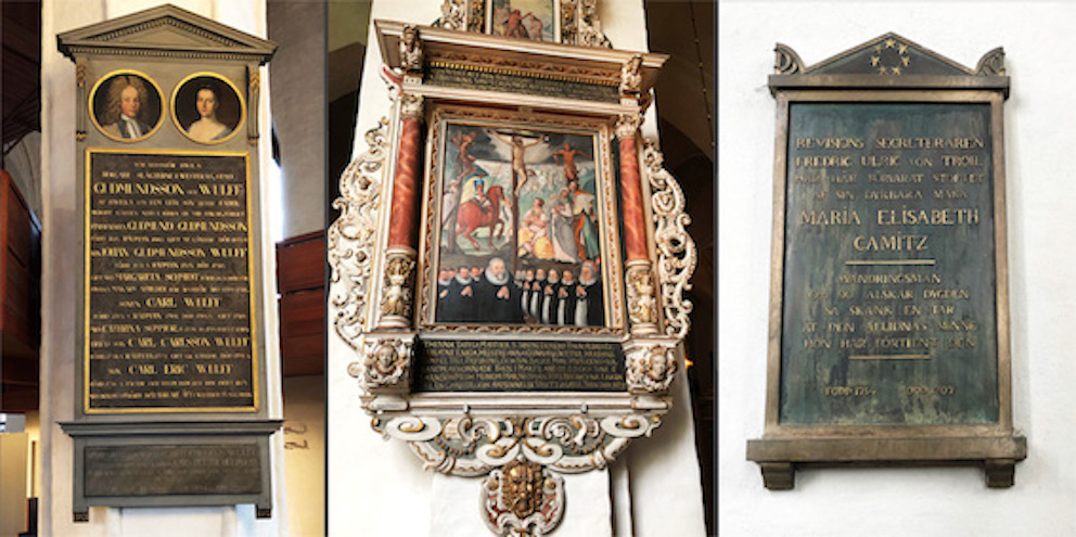 Något som fanns i både katolska och lutherska kyrkor, i katolska från 1300-talet och i lutherska framför allt under 1500- och 1600-talen, var epitafier. Sådana har du säkert sett i svenska kyrkor. Det ska framhäva döda personen som en god kristen. I lutherska kyrkor fick den ofta en rikt arkitektonisk gestaltning; i bland handlade det nog om skryt om rikedom.