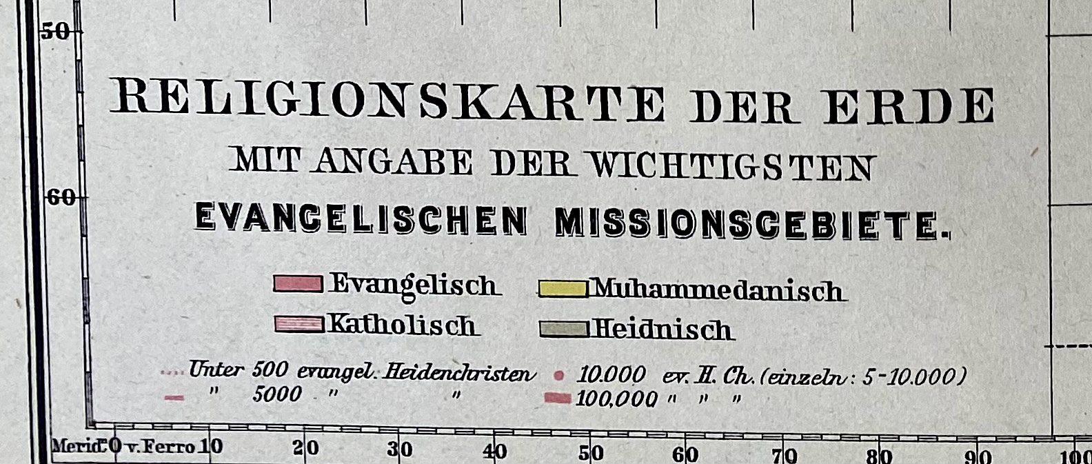 Först en världskarta med rött för de protestantiska områden, rosa katolska, gula muhammedanska, och grått för resten...för hedningarna!