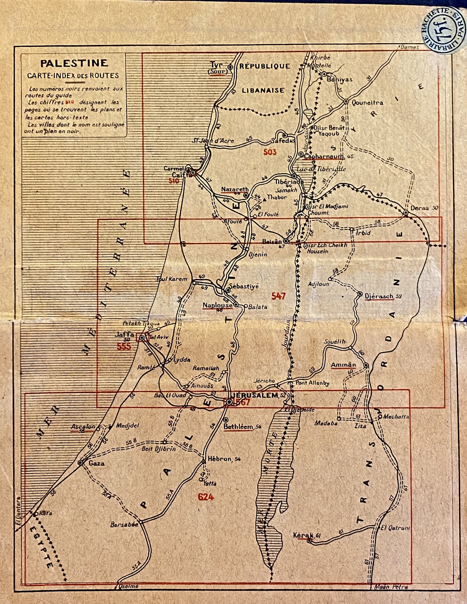 Den franska varianten av Baedeker, Les Guides Bleus. En resebok för Syrien, Palestina, Irak och Transjordanien. 1932 var året, och tydligen har den tillhört den första direktören i nybyggda King David Hotel, schweizaren Joseph A. Seiler. Hotellet blev naturligtvis världsbekant 1946 efter bombattentatet utfört av den sionistiska terrororganisationen Irqun. Som kom utklädda som arabiska arbetare och placerade bomberna i hotellets källare...