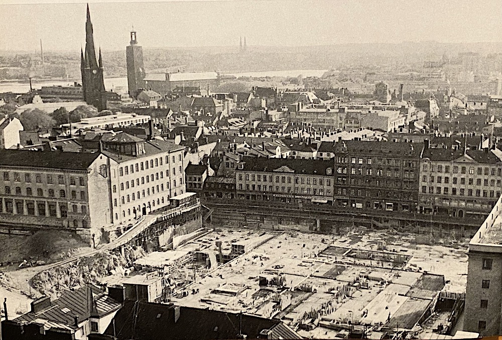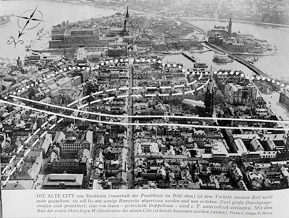 Häftet hittade jag i en bananlåda full med äldre reseböcker. Stockholm, inte helt okritiskt presenterat - Ett par titlar, t.ex. "Experiment Vällingby" och "Nya City"...med bilder som visar tjocka streck i Klarakvarteren där de nya tunnelbanorna kommer att grävas. För de fem höghusen har man redan skaffat plats...