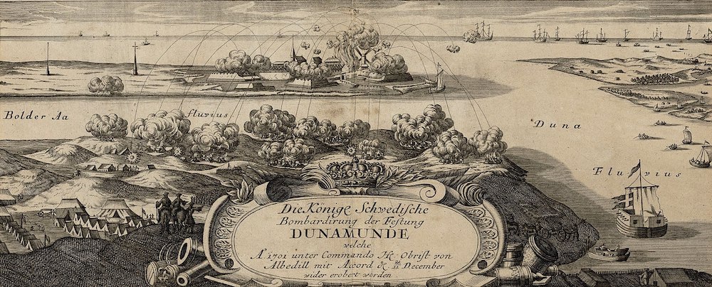 ...som vi översätter till: Svenskarna under ledning av översten von Albedill bombarderar fästningen Dünamünde den 11 december(jul.) 1701.