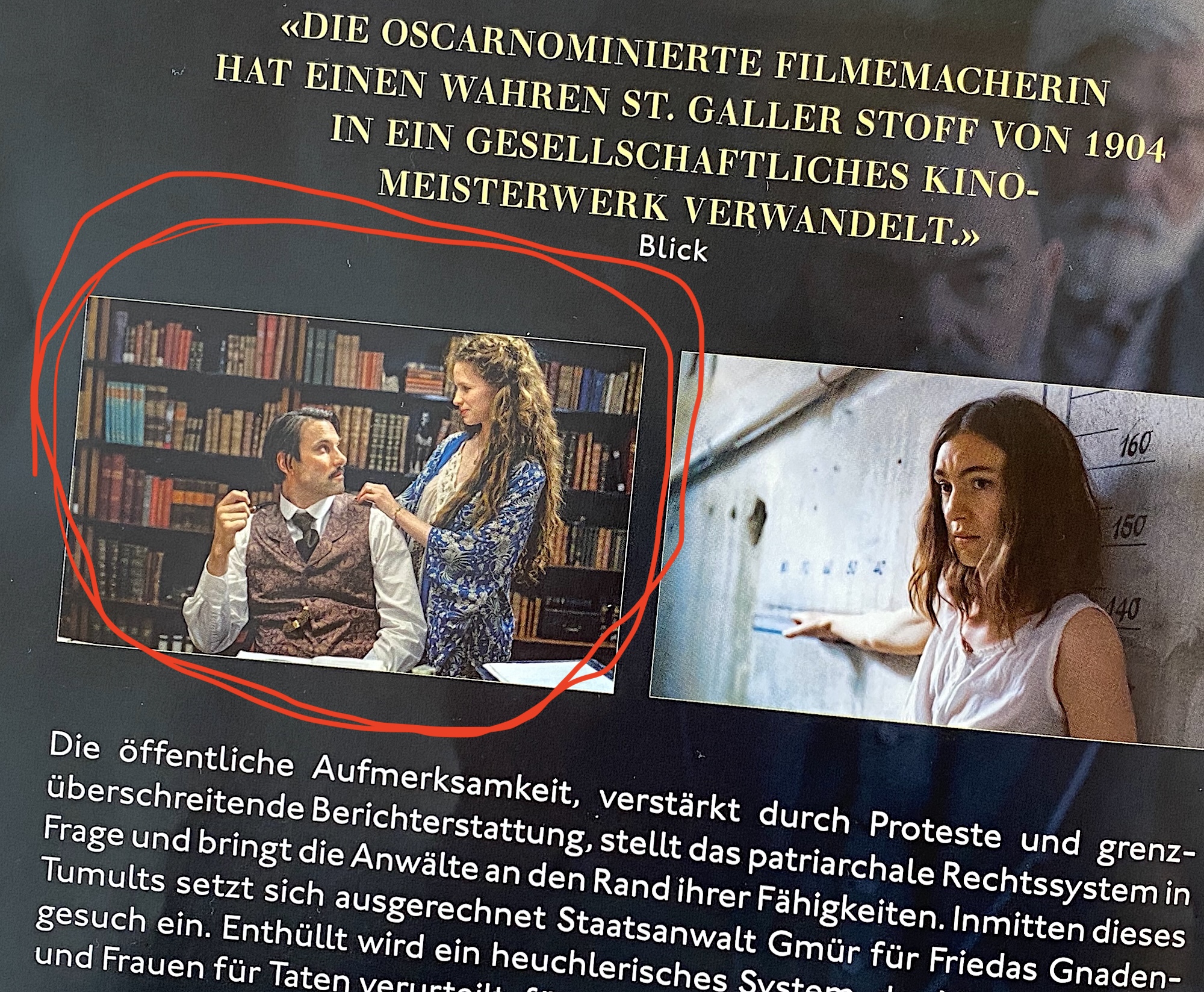 För ungefär ett år sedan ringde en dam, presenterade sig och sade att hon hade uppdrag att skaffa böcker till en filminspelning. En sann historia som utspelade sig här i Schweiz för ungefär 120 år sedan. En kvinna står anklagad för att ha mördat sitt utomäktenskapliga barn. Ett advokatkontor har i filmen en viktig plats. Och där måste allt tidsmässigt stämma, också bokhyllan i bakgrunden!