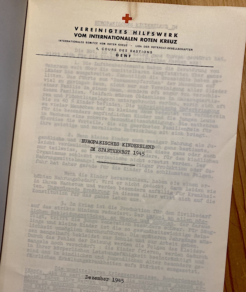 I december 1945 gav internationella Röda Korset i Geneve ut ett memorandum: "Europeiskt barnelände senhösten 1945" Ord och inga visor! Allt från vanvård till hunger och epidemier.