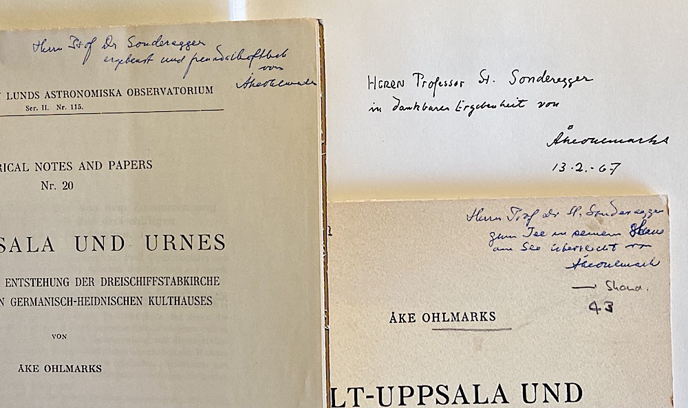 Sonderegger fick sin uppsaliensiska hedersdoktor 1989, som sagt i germansk filologi. Då hade Ohlmarks redan ett par år innan lämnat jordens glädjeämnen och vedermödor bakom sig. Nej, de träffades tidigare, i Klockrike, Ohlmarks var hembjuden/bjöd hem sig själv till professorns sommarnöje nere vid Bodensjön...där han uppenbarligen överlämnade sina signerade verk.