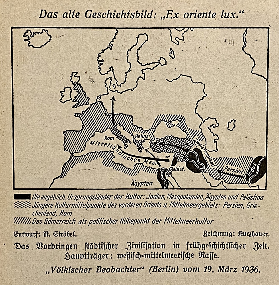 Så - det tyska folket skulle nu lära sig att det som vi ser på den gamla historiebilden är rent nys: "Ex oriente lux" (Ljuset kommer från öster) - med underskriften: "Die angebliche Ursprungsländer der Kultur: Indien, Mesopotamien, Ägypten och Palestina " ( Kulturens påstådda ursprungsländer etc...).