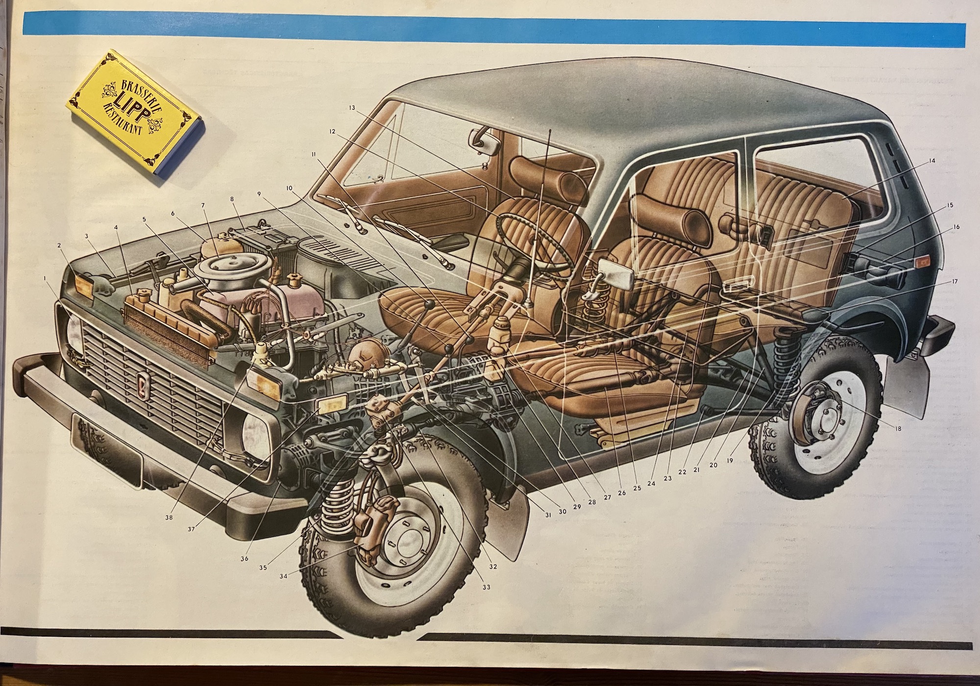Album på enheten LARGE, med färgglada illustrationer och diagram över bilens inre struktur och en detaljerad beskrivning.
