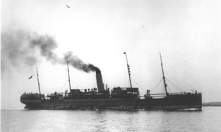 Det är den brittiska Hjälpkryssaren – som omedelbart morserar; What Ship – where from – where bound to?