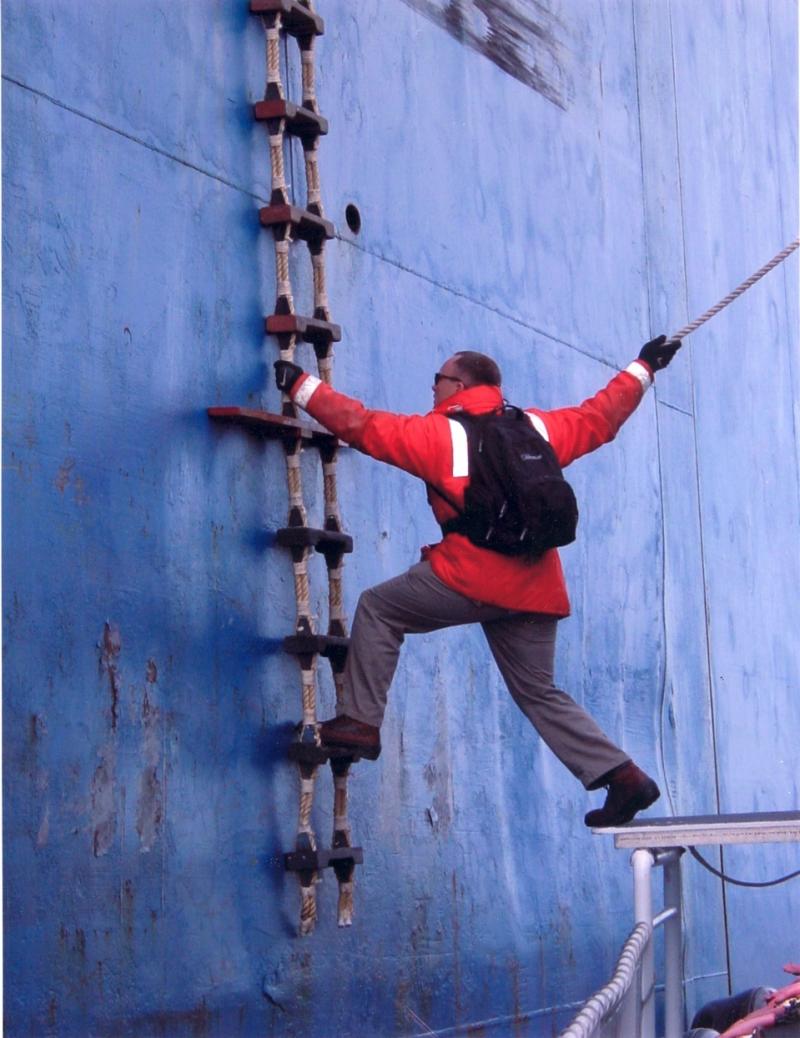 ett hårt ståldäck….Dessutom i sjöhävning rullar fartyget och lejdaren slänger ut från sidan