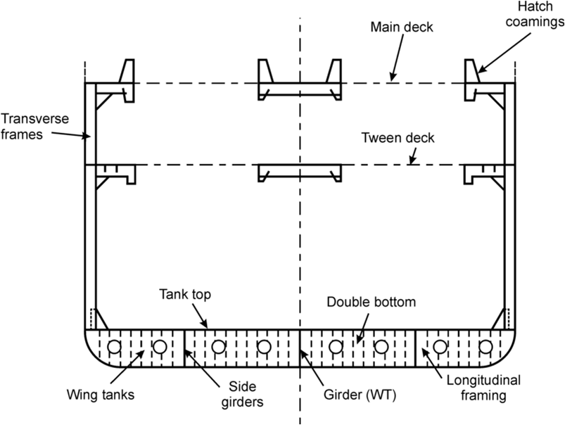 eller mera ovanför – och utrymmet emellan var indelat i vattentäta ‘’celler’’ tvärskepps.