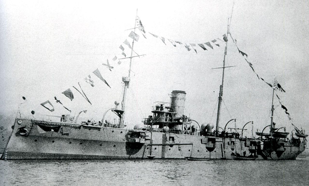 pansarkryssaren CHIYODA – som redan i månader befunnit sig i grannskapet - för att ‘’bevaka japanska intressen…’’ Först misstar sig KORIETZ'S utkikar, tror att japanen är en rysk kryssare – och laddar kanonerna – för en Salutsalva….