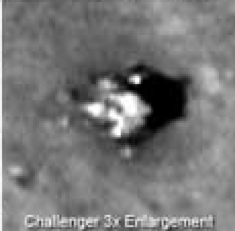Jämför NASA:s 3 gångers förstoring av månlandaren med bilden från den stora bilden varifrån den sägs vara tagen. Ser de två landarna likadana ut? Och vart tog skuggorna vägen till vänster månlandaren? Inte heller ser man bilspåren på NASA:s 3 gångers förstoring.