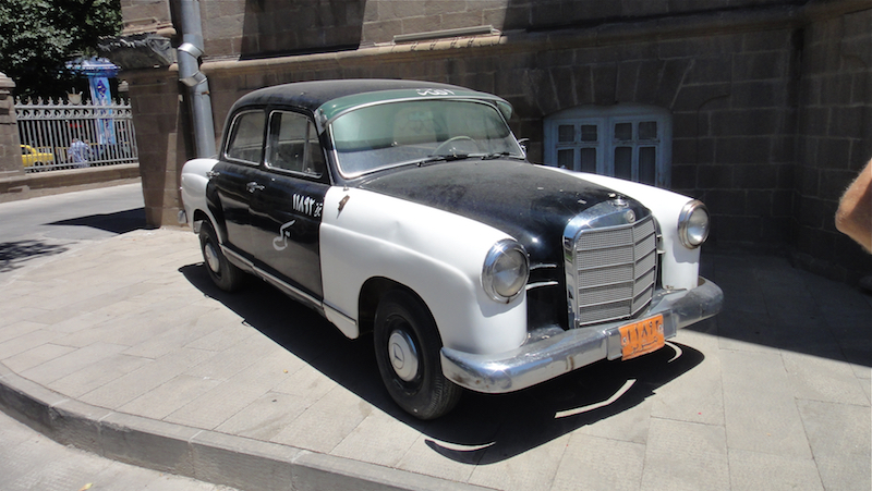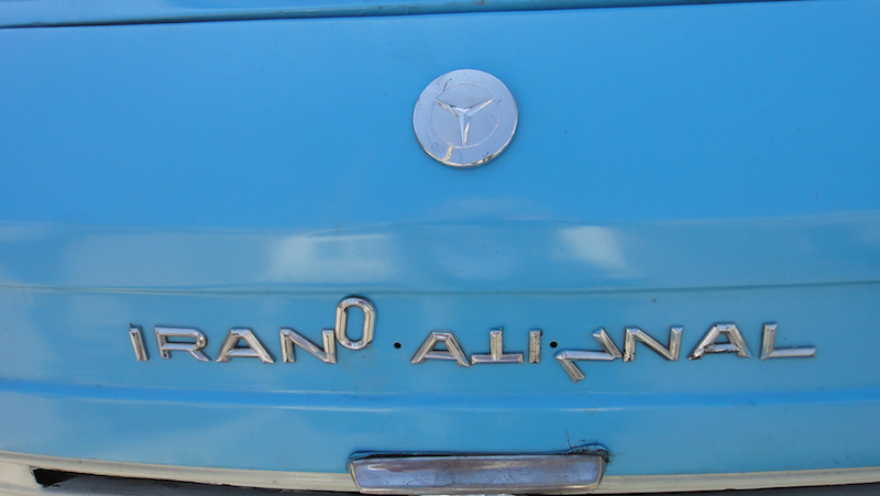 Också helt överraskande, en dammig gammal Mercedes på en innegård. På baksitsen en skylt med texten: Benz. 180. 1957. The first owner Mr. Javad Zadeghan