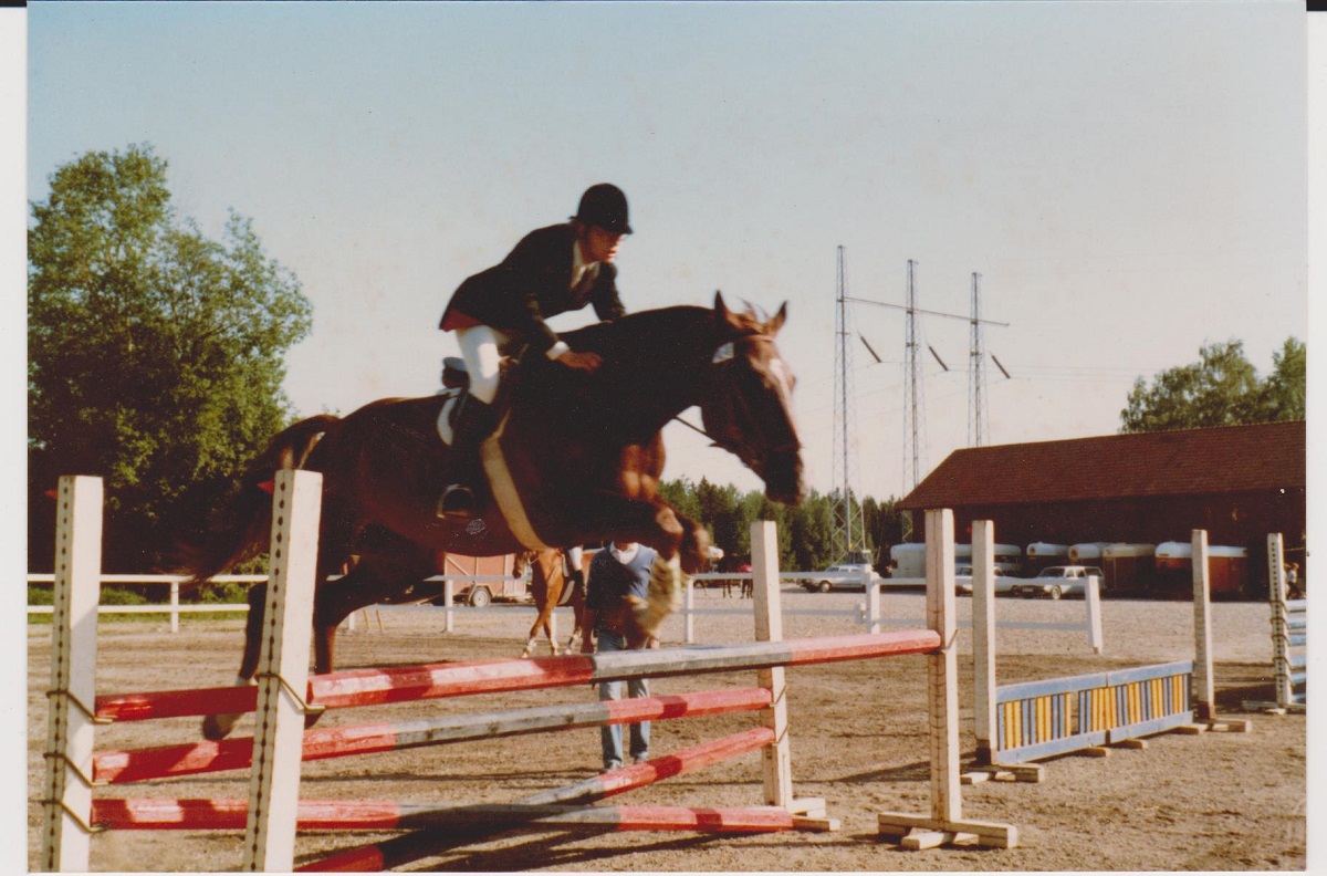 Ni ser på bilden hur hästen hoppar med hängande ben. Det är ingen bra metod att hoppa högt. Det gör hästen av osäkerhet när den inte får använda sin kropp som den vill. Idén med det höja huvudet – försämrade hästens förmåga att hoppa.
