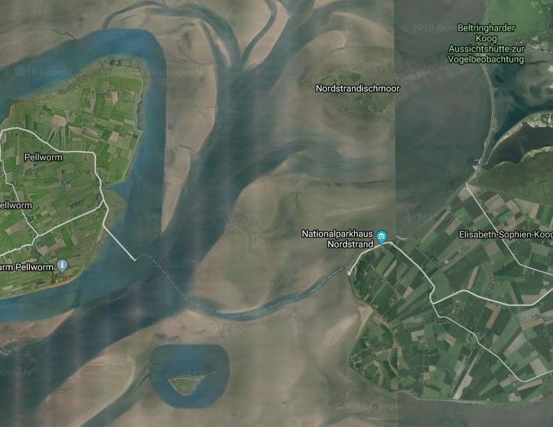Staden Rungholt förstördes i en storm 1362, men resten av ön Strand (som Rungholt låg på) försvann 1634 (det hittade jag inte utan ledtråden "Pellworm" på kartan)