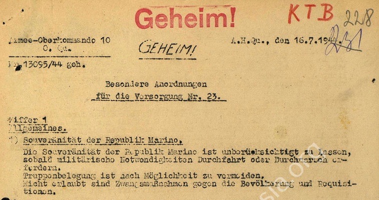 Jag undrar hur många som känner till vad som hände med San Marino under 2 VK. Här ett härligt exempel från 1944 på vad tyska trupper fick för anvisningar när de drog sig tillbaka genom norra Italien. GEHEIM natürlich!