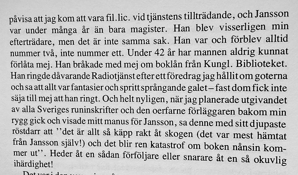 Fiendskapen mellan Ohlmarks och Jansson tycks alltså bottna i en konflikt om en tjänst. Men det är ju inte säkert att Janssons negativa omdömen om Ohlmarks vad gäller goter och runor bara har med denna konflikt att göra. Det kan ju finnas sakliga skäl också. Jag skulle t.ex. kunna tänka mig att Ohlmarks presenterade som säkert att goterna från Götaland (det har jag hört honom säga i ett TV-program av Dag Stålsjö) och att Jansson invände mot detta. Skulle vara intressant att höra Janssons syn på allt detta. Men han är ju död sen länge, liksom Ohlmarks.