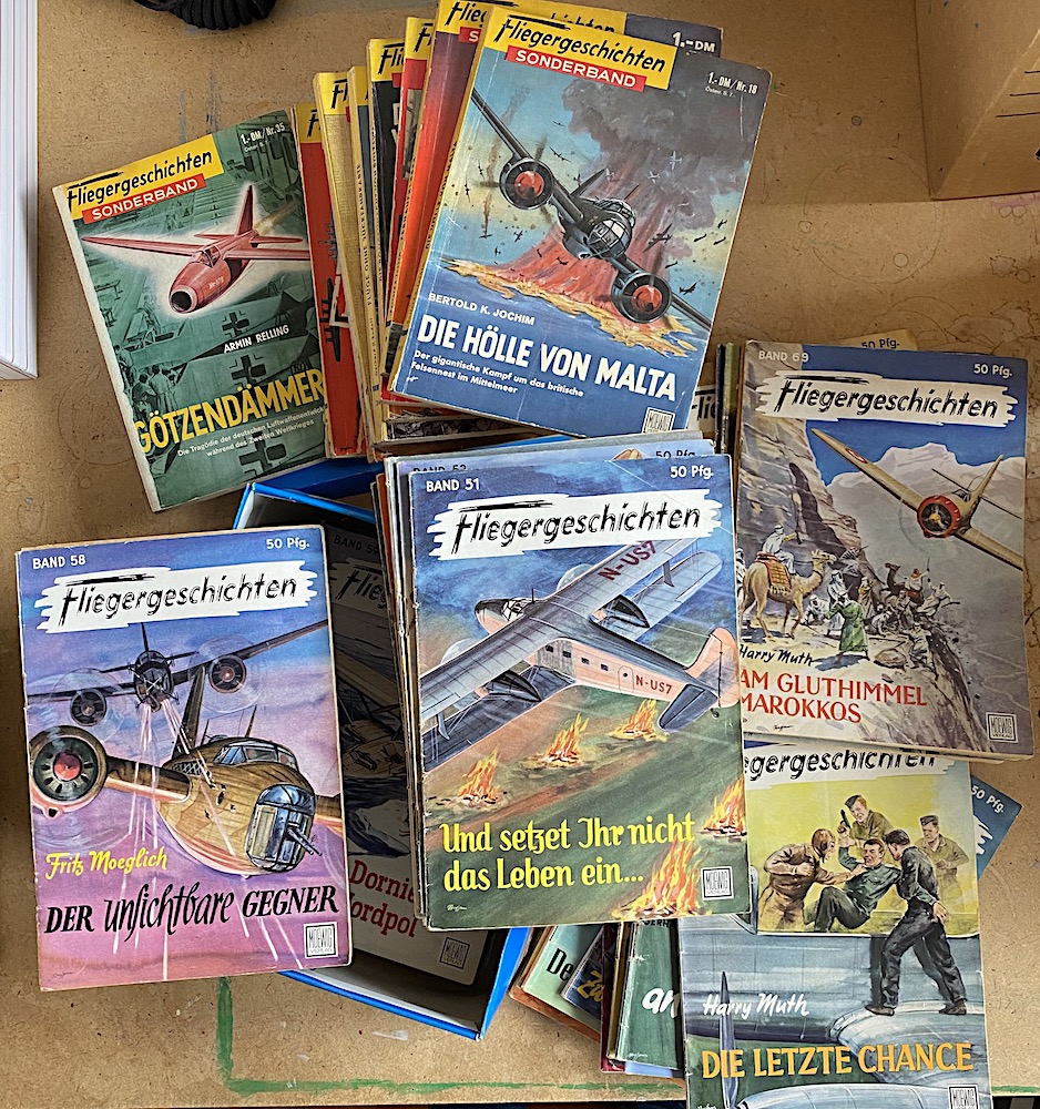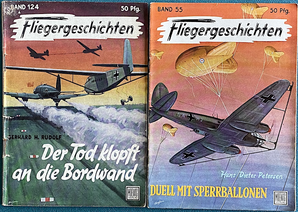 Men det "evigt billiga lässtruntet" som dök upp här intresserade! Tyska "Fliegergeschichten", som Moevig-Verlag i München gav ut under mitten av 1950-talet! Utgivare var Dr Peter Supf, som redan under kriget varit ansvarig för "Kriegsbücherei der deutschen Jugend". Varje vecka ett nytt häfte med "pedagogiskt riktigt" innehåll...