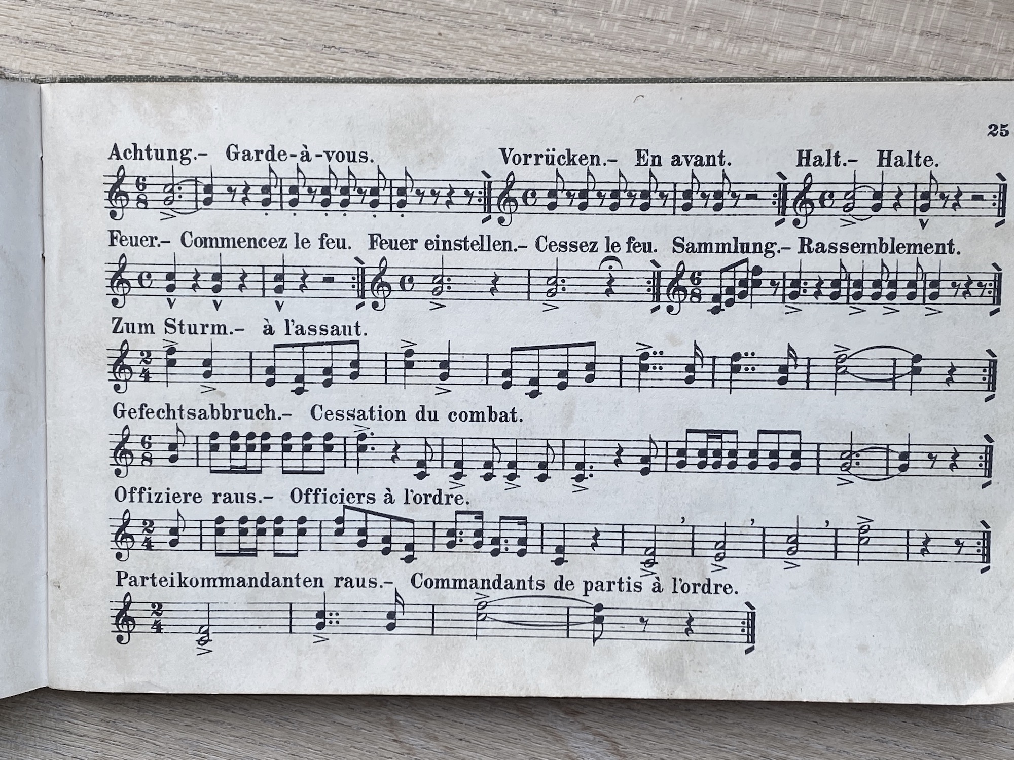 Och här har vi en schweizisk instruktionsbok som visar hur en militär trumpet skulle låta. Ordentligt gammal, från slutet av första världskriget, september 1918, och naturligtvis tvåspråkig, tyska och franska! Södra Klockrike hade väl sin egen italienska variant.