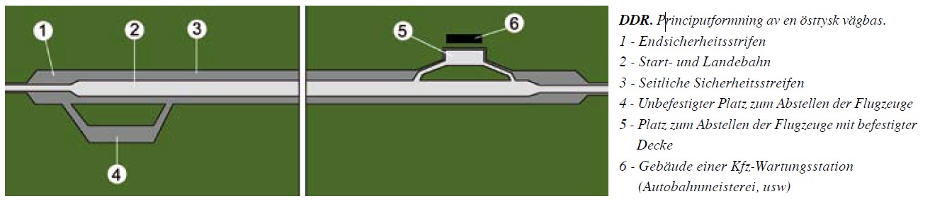 Typutformning av väst- och östtyska reservvägbaser: Finsk reservvägbas i direkt anslutning till Rovaniemi flygbas. Observera att den har ett färdigt stråk (det öppna området vid sidan av rullbanan), jämför med hur nära skogen går vägen i södra änden efter rullbanan. I norr syns en större platta och i söder en kringkörningsväg. Numera ukrainsk reservvägbas strax väster om Krupets. Den sovjetiska utformningen var som synes lite mer påkostad än den finska (eller svenska för den delen) med stora plattor med taxivägar en bit ifrån rullbanan. Detta torde ha varit en standardlösning inom hela WP, jämför med den östtyska utformningen ovan.