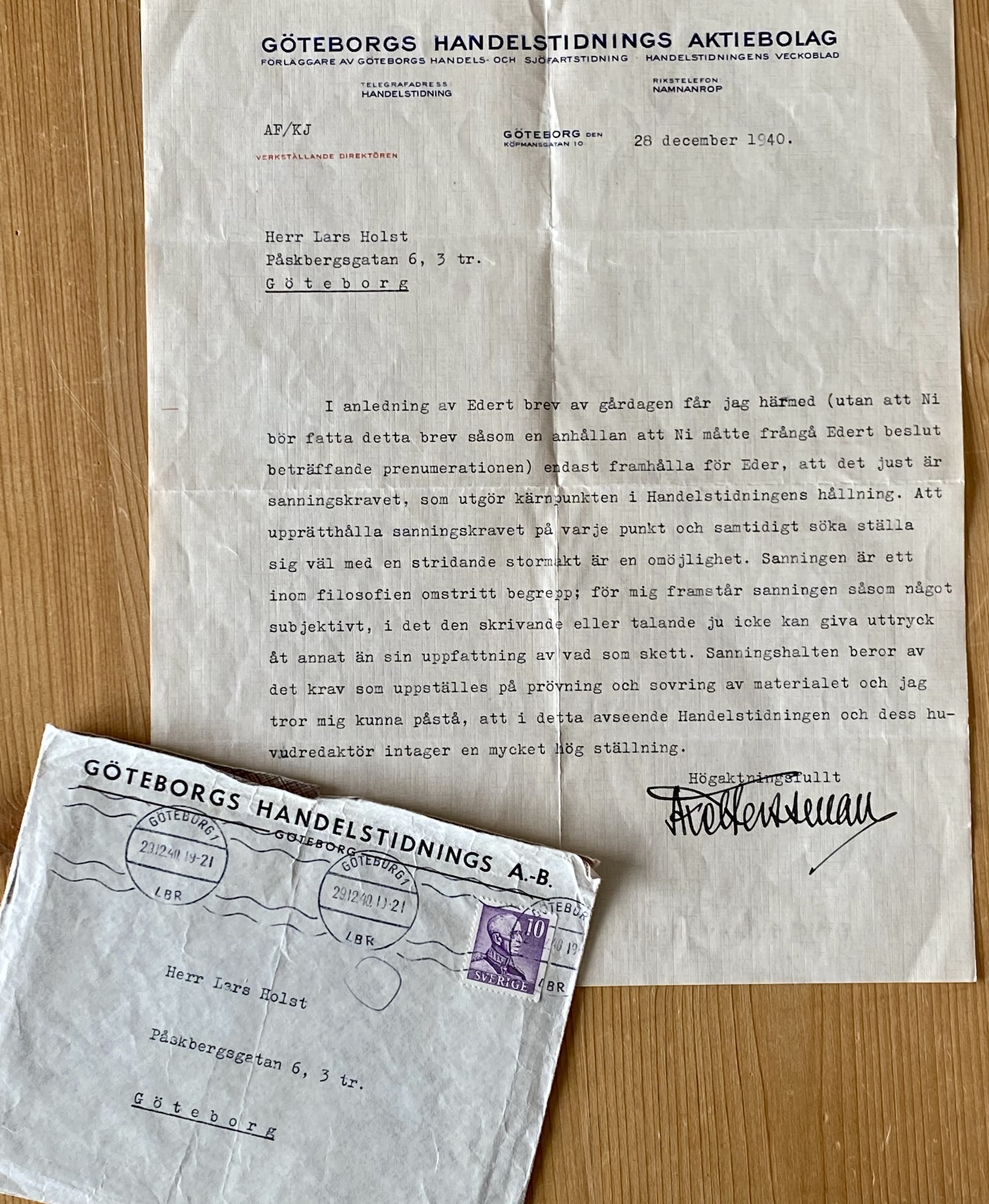 Lars Holst har i december det året avbeställt sin prenumeration på Göteborgs Handels- och Sjöfartstidning. Det brevet har vi inte, men jag har här framför mig svarsbrevet från Axel Forsmann, huvudägaren och ordförande i tidningens styrelse https://gamlagoteborg.se/2016/02/06/axel-forssman/ .